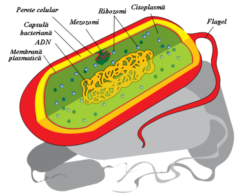 - La exterior, flagel și pilus care se proiectează de pe suprafața celulei. Acestea sunt structuri (nu sunt prezente în toate celulele procariote) din proteine care facilitează deplasarea și comunicarea între celule;